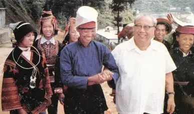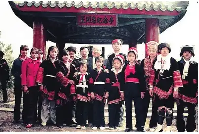 1988年12月,费孝通在六巷乡王同惠纪念亭缅怀前妻王同惠,并与瑶族同胞合影。