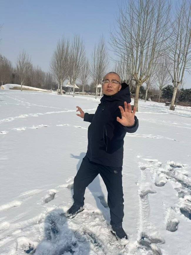 雪落其肩,若缀碎玉;风拂其面,似理丝簧。然薛兄心无旁骛,意守丹田,神游物外,情寄太极之玄妙,思入阴阳之无疆。