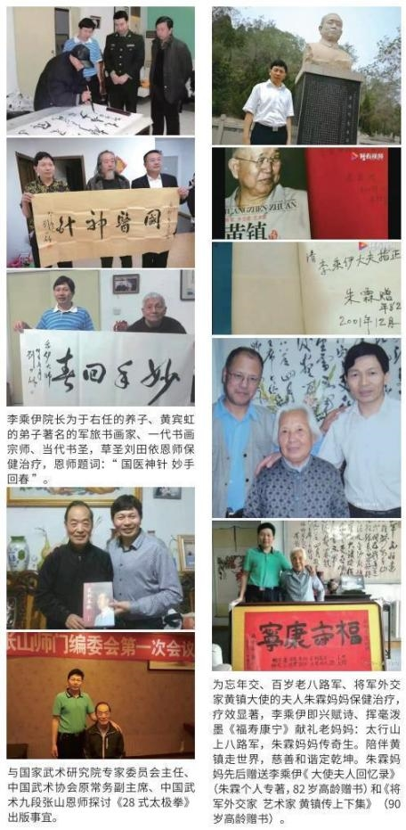 自古至今 ,每一位在人生事业上有着突出成就的学者 ,做任何事 情 都能取得一定的成绩。作为武学、 中医都精通的李乘伊教授 ,在中国书画、诗词方面也有极高造诣 ,即兴赋诗 1000 多首 ,并在 2014 年正式拜千古草圣于右任先生养子、书画巨擘黄宾虹先生弟子 刘田依大师为师系统学习中国书画鉴 定和“标准草书千字文大字典” 的整理、编辑、宣传、推广工作。他的书画作品被多国政要、将军、 企业家收藏。