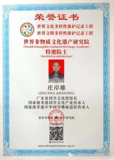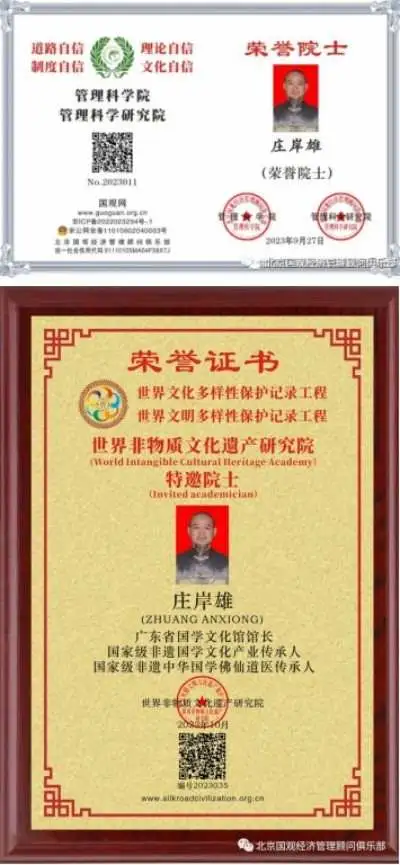 2019年度首届佛学文化最具影响力冠军金牌佛学法师称号。2019年聘请您担任中国国际报告文学研究会-国学文化传承委员会副会长。2019年被聘请您为“中国国学文化建设委员会广东分会常务副会长”。同时兹聘请您为中国文化建设委员会广东分会常务副主席。2019年被评为建国七十周年国学文化卓越人物荣誉称号。同时特授予建国七十周年文化建设功勋人物荣誉称号。共和国十大国学文化传承大使。邀请入编中国未来研究会科技未来研究分会2020年挂历封面人物。2020年度被评为中国长城铭刻人物。百度媒体达人佛医双修大师庄岸雄奖杯。荣得华夏功勋人物名师百科庄岸雄奖杯。受邀出席中国世纪大采风二十周年庆典,国学佛教界形象大使。被授予中国当代英才人物荣誉称号。2020年获得聖旨九龙大印,佛医双修大师庄岸雄印章。2020年兹聘请为我院国学文化研究课题客座教授。元培智库中华学委会客座教授北大博雅。被授予您为“广东省荣誉市民”称号。兹聘您为“广东省人民政府国学文化顾问”。被授予您为“国学文化终身荣誉称号”。授予入选2020年度《长城人物》。特聘任您为“广东省国学文化馆馆长”。兹聘您为“中国未来研究会科技未来研究分会第四届理事”。2021年兹聘您为“广东省政协委员”。2021年荣得盘龙大印章、今古大法师庄岸雄印。第四届国际中国公益事业大典我和我的祖国庄岸雄,2020年度国际公益传播奖。美国恩恩月播放。2021年入篇书籍展望广东十四五。建党100周年之际、作出的突出贡献、特授予您、巜广东省佛医终身荣誉》称号。2021年广东省劳动模范荣誉称号。中国管理科学研究院商学院客座教授。2022年特聘您为“健康中国行动、健康宣传大使”。为俄罗斯传统东方医学专家学会专家委员。2023年国家荣誉称号人民楷模荣誉勋章。国医大师功勋人物。五一全国劳模、全国易学劳模。全国中医劳模。2023年国家荣誉称号国医泰斗荣誉勋章及证书。2023年国家荣誉称号国医圣手。2023年国家荣誉称号佛医战略科学家证书及牌匾。中国共产党成立102周年荣获世界艺术大师。中医药传承人称号。2023年6月荣获清华大学(EMBA)工商管理总裁研修班结业证书。2023年7月荣获新时代非遗文化传播大使荣誉。摩尔多瓦共和国驻华大使馆特邀保健中医。中华名医功勋人物。致敬榜样感恩有您、最美奋斗者。广东省南粤创新奖。中国易学专家委员会副会长。中国中医专家委员会常务副会长。中华医学君臣佐使秘方传承。主治、跌打扭伤风湿老积、无名种毒、奇难杂症、等、多谢大家支持我、以后我更加努力、将中华国学传承文化发扬光大。