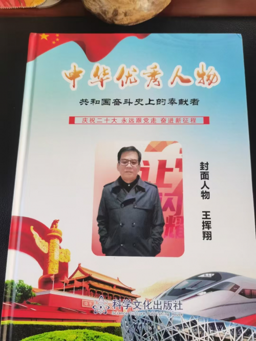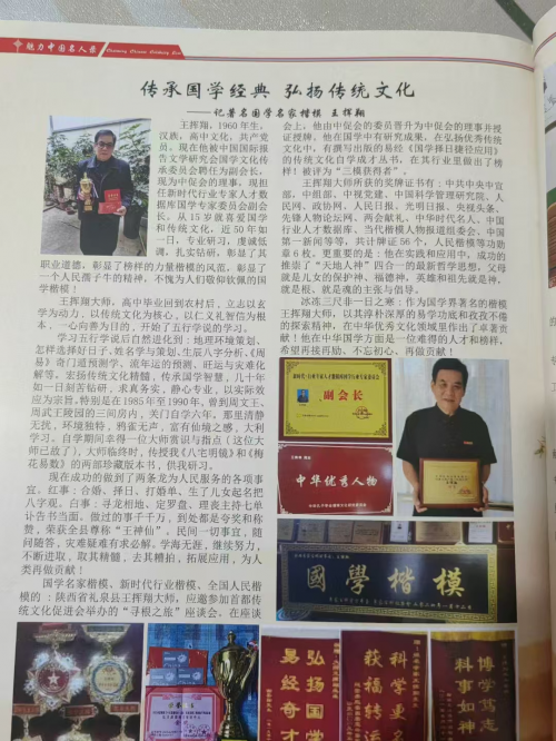 3.由科学文化出版社出版的《中华优秀人物》共和国奋斗史上的奉献者一书中,既是本书单独封面照,又在344页刊登了王挥翔创作的易经《国学择日捷经应用》。