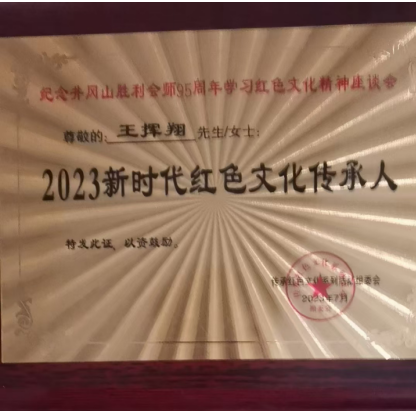 6.由中国国际经济合作促进会健康科技工作委员会出版的《2023新时代红色文化传承人物大典》一书中,纪念井冈山胜利会师95周年,书内317页刊登了:榜样的力量一一王挥翔国学大师。