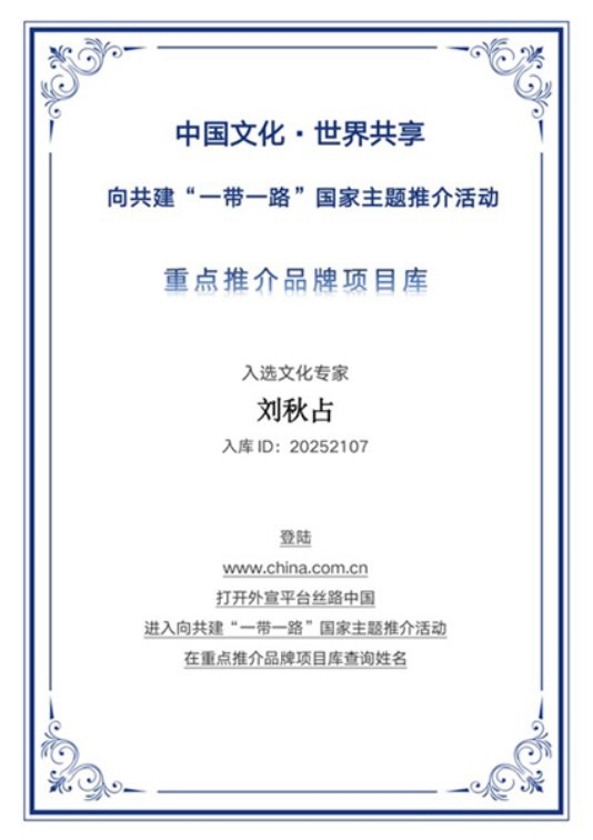 2025年,河南易学文化专家刘秋占,以其四十余年坚守探索、开拓创新的卓越成就,成功入选“一带一路”国家主题推介重点推荐品牌库,并获专属入库ID。公众可通过中国网“丝路中国”平台进行查询与验证。这一荣誉,不仅是对他个人学术贡献的充分肯定,更是易学文化在新时代焕发活力、走向世界的生动注脚。