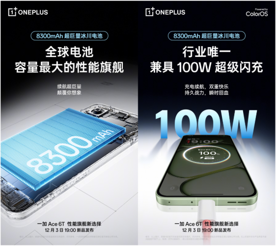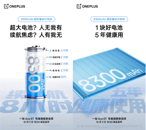 2025年11月28日,一加 Ace 6T官宣首发8300mAh超巨量冰川电池,引领性能旗舰迈入 8000+mAh 超巨量时代,同时支持100W 超级闪充,是行业唯一同时兼具8300mAh 电池和百瓦闪充的手机。本次发布的一加 Ace 6T旗舰配置全面升级,首发全球当代旗舰芯第五代骁龙8,搭载全新一代「风驰游戏内核」,更有8300mAh超巨量冰川电池,实力强悍,将于12月3日晚7点正式发布。