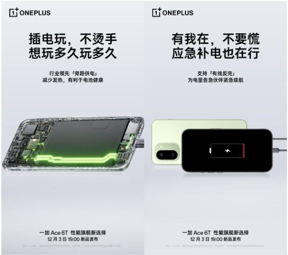 此外,一加Ace 6T支持「旁路供电」和「有线反充」两大充电技术。行业领先的「旁路供电」功能,让一加Ace 6T在边充电边游戏的场景中,电流能绕过电池,直供系统,避免发热升温导致的卡顿,有效延长电池寿命。而有线反充则能为电量告急的其他设备,手表、耳机等产品紧急补电,减少续航烦恼。