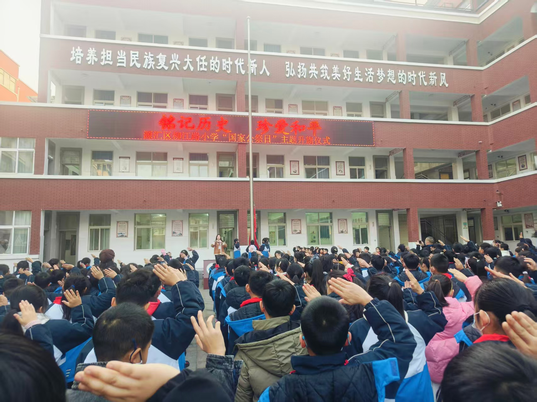 12月8日清晨,全体师生齐聚操场,参加漯河市源汇区柳江路小学庄严的国家公祭日主题升旗仪式。伴随着雄壮的国歌,五星红旗冉冉升起,全校师生行注目礼,爱国之情在胸中激荡。升旗仪式上,学生代表以《勿忘国耻 吾辈自强》为题发表国旗下讲话,深情回顾那段山河破碎的岁月,号召同学们铭记历史教训,传承先辈精神,以少年之朝气担起民族复兴之重任。随后,全场师生肃立默哀,缅怀在侵略战争中遇难的同胞,坚定守护和平的信念。凛冽的寒风中,师生们的眼神坚定而执着,共同诉说着“振兴中华”的初心与誓言。