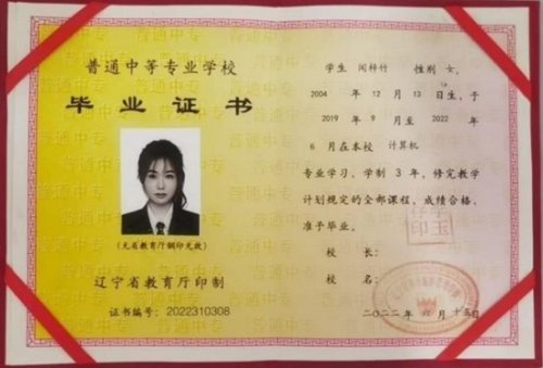 2019年9月至2022年6月,闻梓竹就读于普通中等专业学校计算机专业,系统学习了三年计算机核心课程,拿到了由辽宁省教育厅印制的毕业证书。