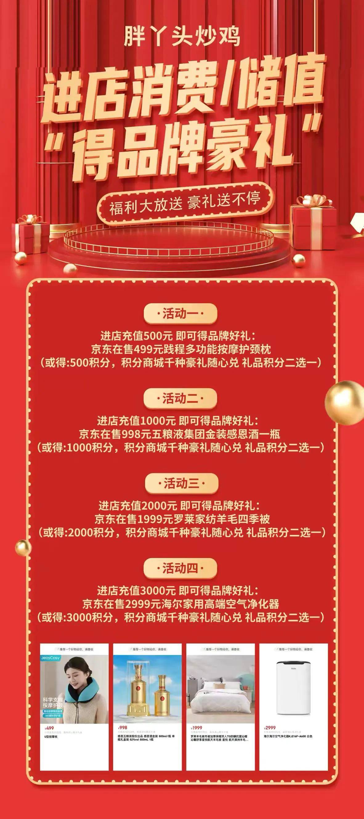 此次双庆盛宴,胖丫头炒鸡实力宠粉,活动期间进店充值即享重磅品牌好礼,积分礼品二选一,千种好物随心兑换,实现美食吃到肚满、好礼拿到手软:充值500元可获京东在售499元践程多功能按摩护颈枕或500积分(积分商城千种豪礼随心兑);充值1000元可获京东在售998元五粮液集团金装感恩酒一瓶或1000积分(积分商城千种豪礼随心兑);充值2000元可获京东在售1999元罗莱家纺羊毛四季被或2000积分(积分商城千种豪礼随心兑);充值3000元可获京东在售2999元海尔家用高端空气净化器或3000积分(积分商城千种豪礼随心兑),福利满满诚意十足。